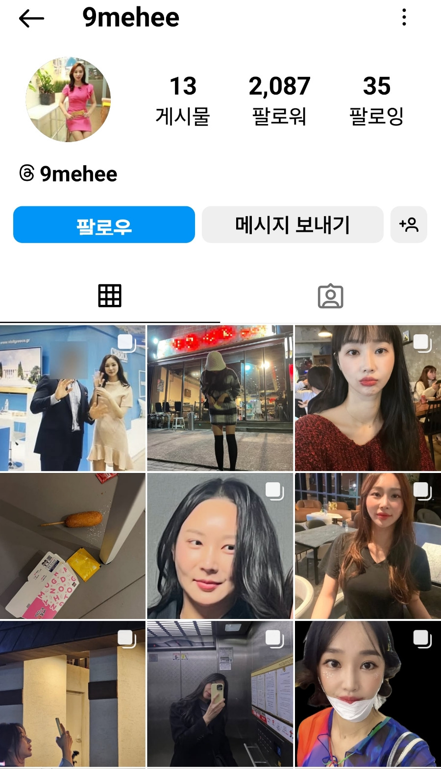 일단 나는솔로 옥순님 인스타 아이디는 @9mehee로 과거 사진들을 볼 수 있는데 뭔가 사진빨이 잘 안받는거 같아요. 나는 SOLO에서 본 미모를 다 못담는듯?