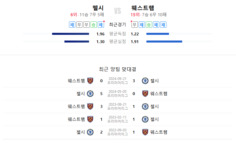 | 항목 | 첼시 | 웨스트햄 |