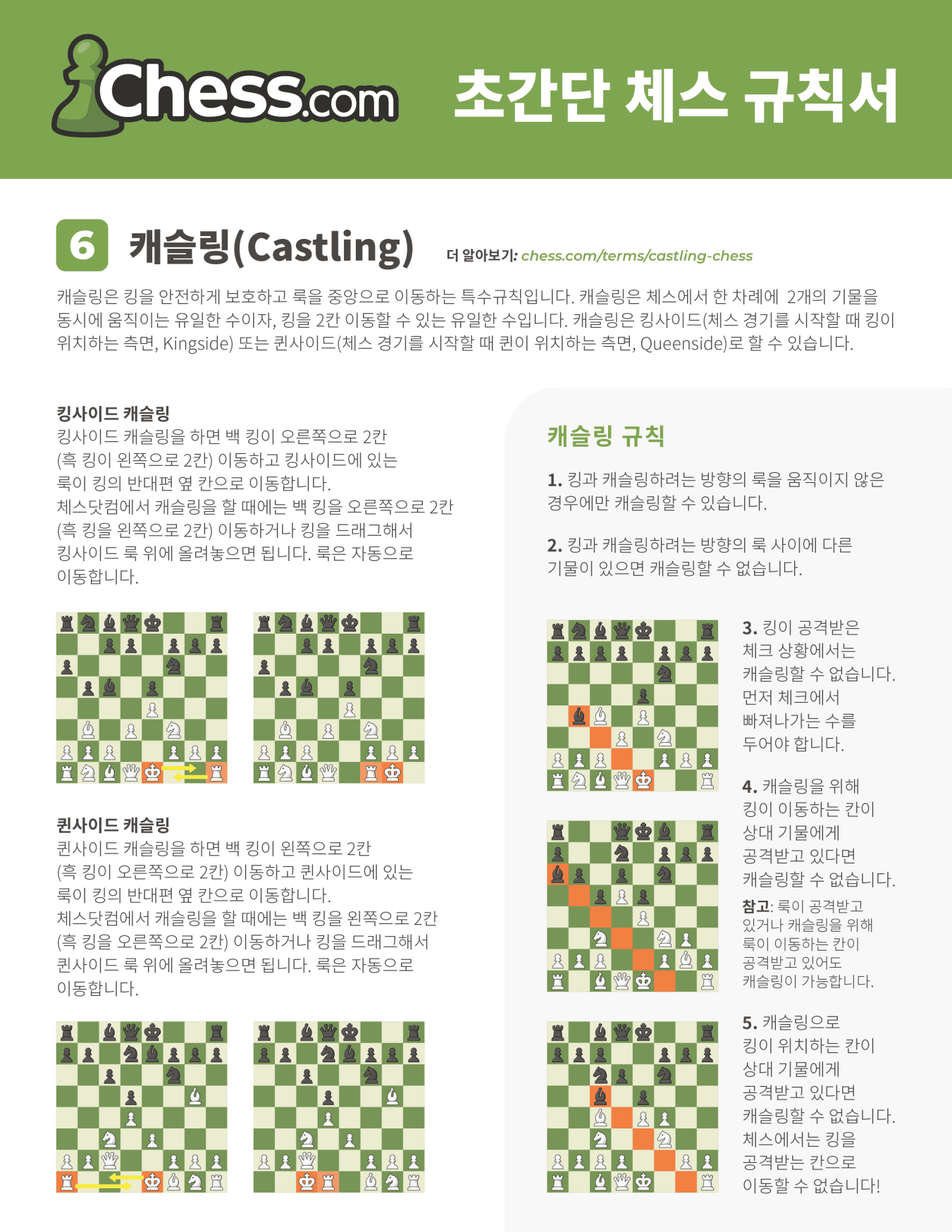 - 캐슬링(Castling): 킹과 룩이 한 번에 이동하여 킹을 안전한 위치로 옮기는 수입니다. 조건을 충족해야만 가능합니다.