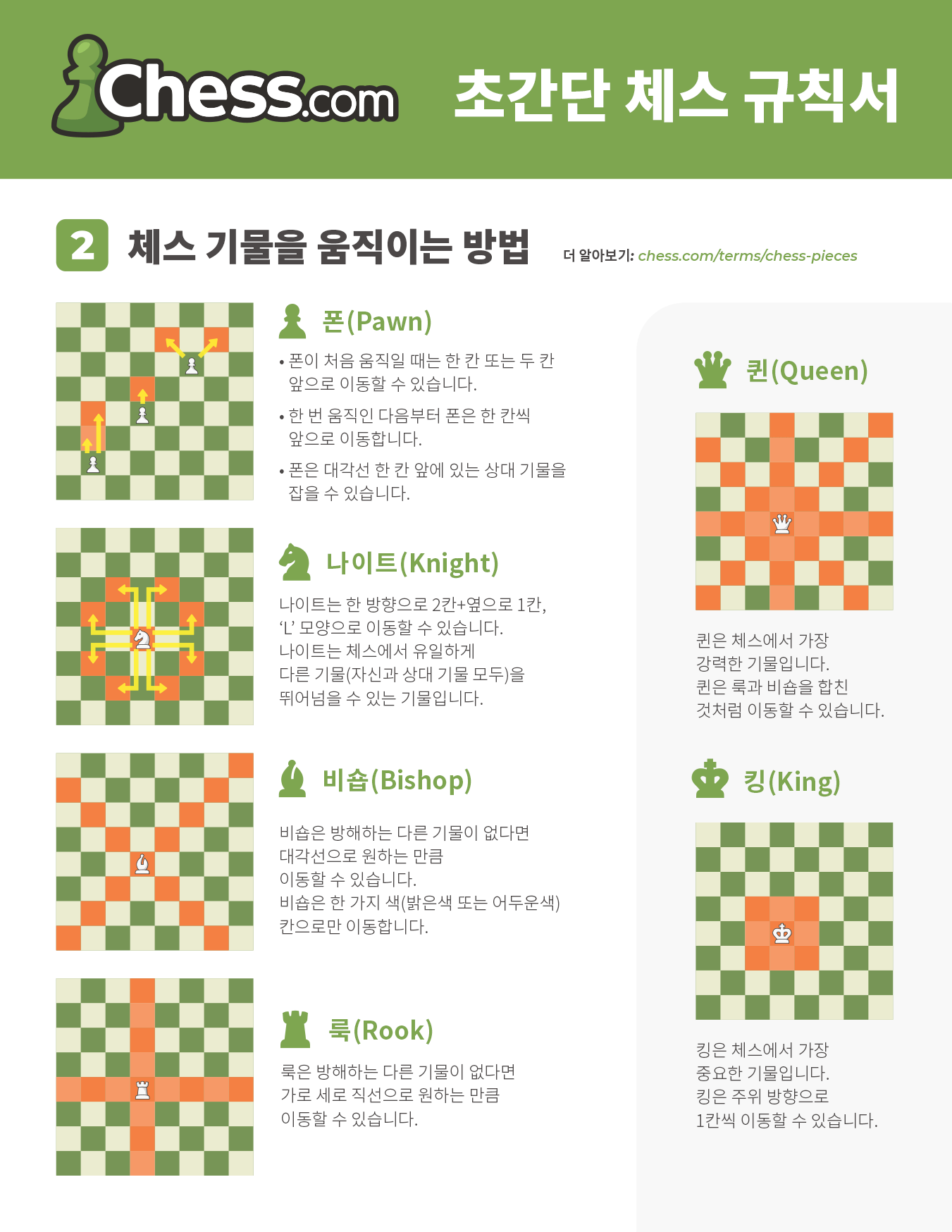 - 퀸(Queen): 직선과 대각선으로 원하는 만큼 이동할 수 있습니다.